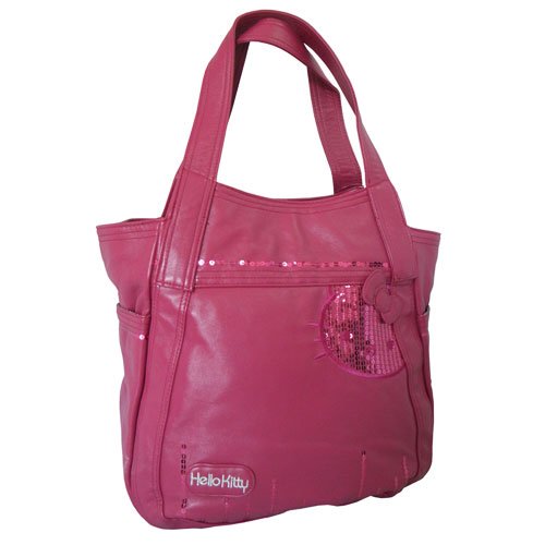 Grand sac Shopping rose Hello Kitty Sequins En Polyuréthane. Doublure 100 % polyester, à pois noir sur fond blanc, satiné. 1 poche sur chaque côté. Compartiment principal zippé renfermant une petite poche zippée et deux autres poches. Dimension : 38 x 34 x 14.5 cm